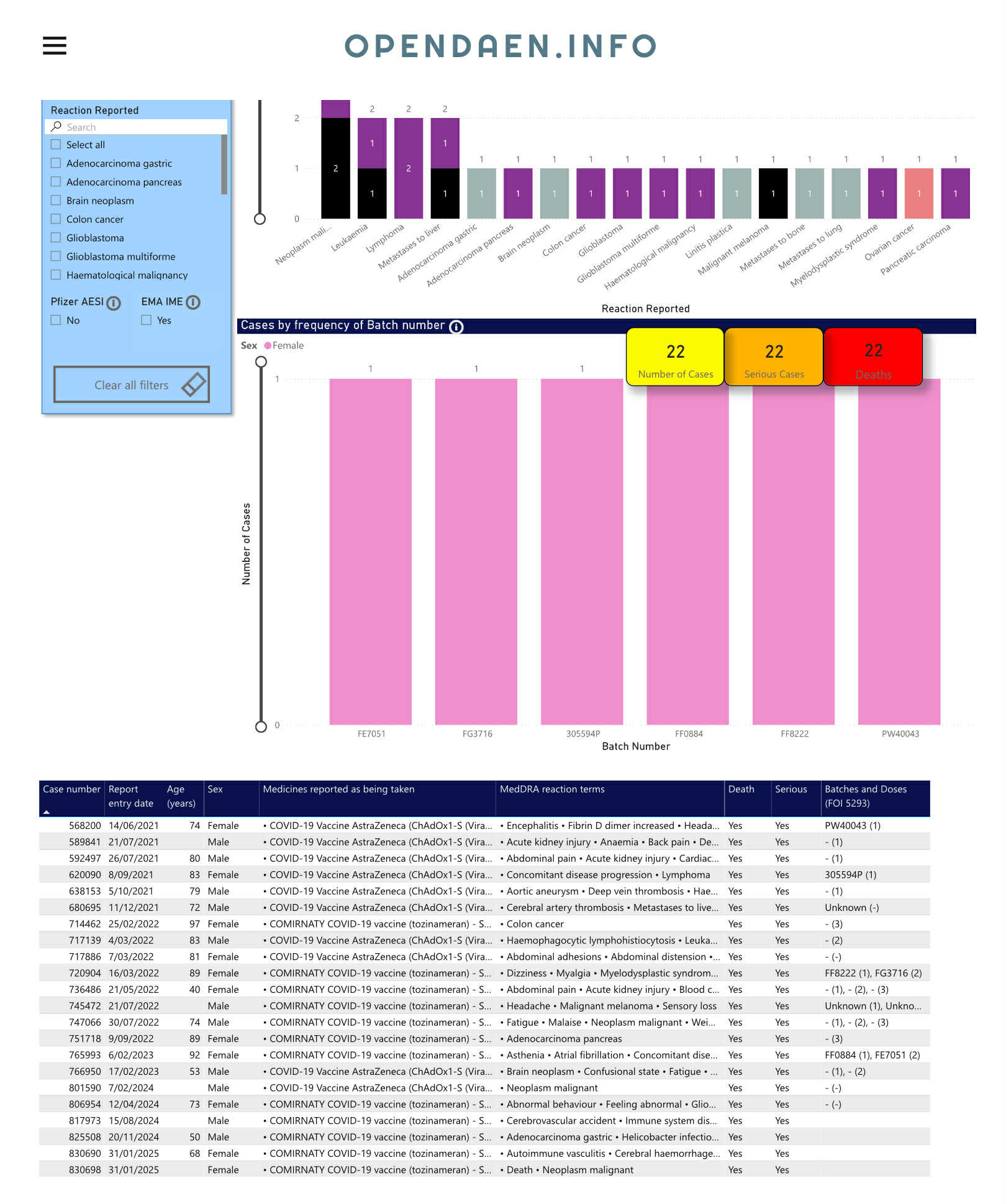 OpenDAEN.Info is a non-commercial and not-for-profit website for the research, study and review of the TGA (Therapeutic Goods Administration) DAEN (Database of Adverse Event Notifications) system in respect of COVID-19 vaccines. The primary source of data on OpenDAEN is the TGA DAEN system and their published FOIs (Freedom of Information).