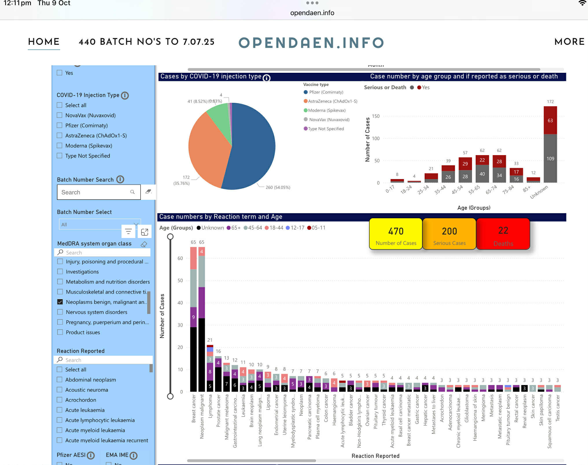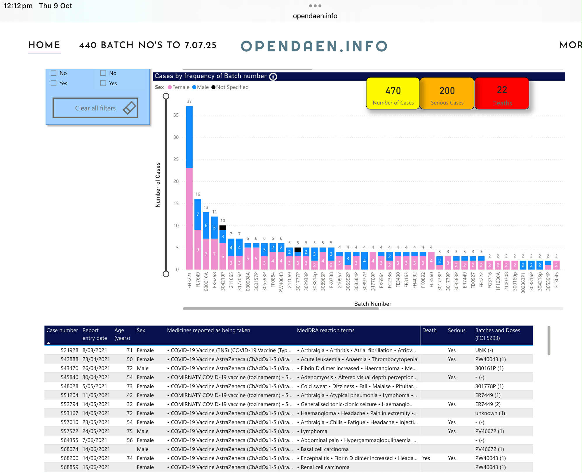 For example, choose Column F for "MedDRA reaction terms" i.e. Myocarditis, Pericarditis, Breast Cancer, Prostate Cancer, Abortion spontaneous (miscarriages), Bell's palsy, Glioblastoma (brain cancer), Guillain-Barre syndrome etc. You can then filter the batch numbers in Column I (sourced from TGA FOI 26-1963) and also for Deaths "Yes" (uncheck 'blanks') in Column G. Please note, as there are 141,666 rows of data in 9 Columns, this is a lot of data for excel, and sometimes it does 'lag'. Alternatively, you can use the OpenDAEN database for information, which is quick and easy; but at least this excel document can be downloaded and then utilised via the filters and search box, by any interested website viewers.